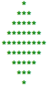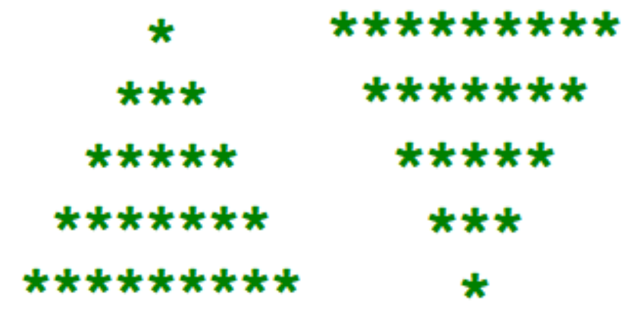 더보기public class Test064 { public static void main(String[] args) { for (int i=0; i<5; i++) { for (int j=0; j<5+i; j++) { if (j<=3-i) System.out.print(" "); else System.out.print("*"); } System.out.println(); } for (int i=0; i<4; i++) { for (int j=0; j<8-i; j++) { if (i>=j) System.out.print(" "); else System.out.print("*"); } System.out.println(); } } }