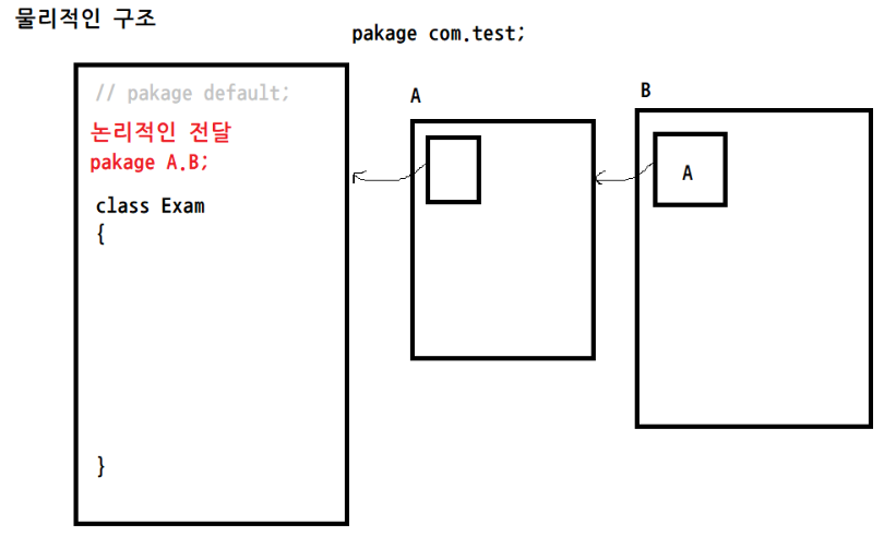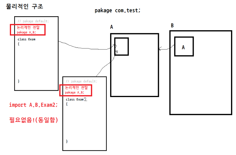 2) pakage A.B; << 자바가 모든 디렉토리를 확인하지 않아도 구조를 파악하여 찾을 수 있게 해주는 것