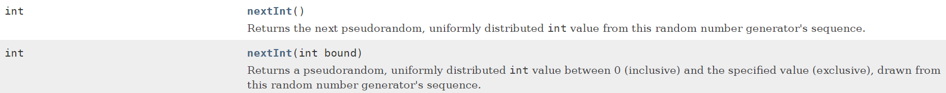 - bound 는 정수이며, 이 때, 0 이상 bound 미만의 범위의 정수 내에서 난수를 1개 발생 시키는 메소드