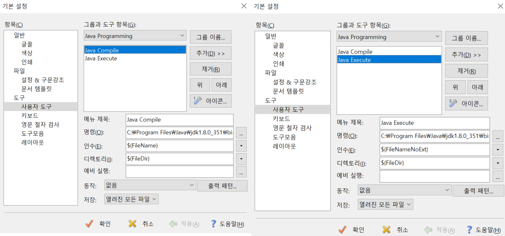 - 파일항목에서 백업파일생성 체크 해제- 글꼴 : 나눔고딕코딩으로 하기- 도구 - 사용자도구에서 Java Programming 그룹 생성 후 Java Compile, Java Execute 추가하기